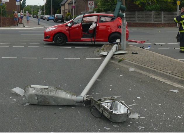 Gegen 17:25 Uhr war ein 19-jähriger Jülicher mit seinem Pkw auf der Linnicher Straße stadtauswärts unterwegs. In Höhe des Abzweigs Schulzentrum wollte er nach links abbiegen. Nachdem er an der Rot zeigenden Ampel gewartet hatte, bog er zügig ab, als sie auf Grünlicht umsprang. Den entgegenkommenden Pkw eines 53-Jährigen aus Jülich sah er wohl, ging jedoch nach eigenen Angaben davon aus, noch problemlos vor ihm links abbiegen zu können. Im Kreuzungsbereich kam es dann zur Kollision beider Fahrzeuge. Das Auto des 19-Jährigen drehte sich dabei und stieß gegen einen Ampelmast.