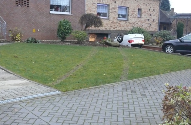 Bei einem Verkehrsunfall in Huchem-Stammeln landete am Samstagnachmittag ein Pkw auf dem Dach und blieb in einer Garagenzufahrt liegen. Der Fahrer wurde dabei verletzt. Kurz vor 15.00 Uhr hatte ein 25-Jähriger aus Niederzier mit seinem Pkw die Köttenicher Straße in Fahrtrichtung Stammelner Straße befahren.