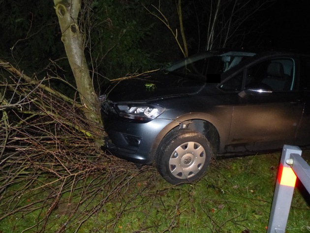 Gegen 05:40 Uhr erhielten die Beamten Kenntnis von einem Verkehrsunfall, dessen Verursacher sich aus dem Staub gemacht hatte. Der oder die bislang unbekannte Fahrer/-in war auf der Straße Am Römerpark unterwegs gewesen und von dieser aus nach links in die Straße Auf der Komm abgebogen. Hierbei hatte er oder sie die Kontrolle über das Fahrzeug verloren, war nach rechts von der Straße abgekommen, hatte einen Leitpfosten sowie eine Grünfläche überfahren und war schließlich gegen einen Baum geprallt. Als die Polizisten am Unfallort eintrafen, fehlte von den Insassen jede Spur. Der Wagen wurde sichergestellt.