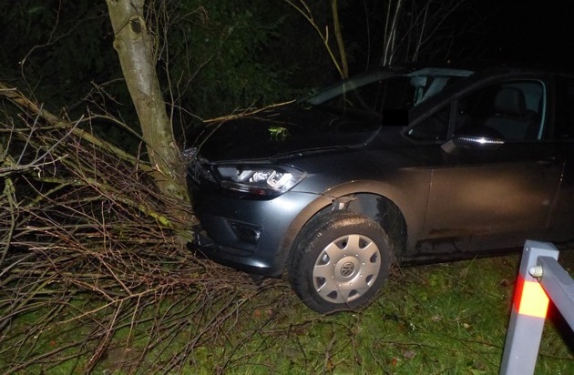 Gegen 05:40 Uhr erhielten die Beamten Kenntnis von einem Verkehrsunfall, dessen Verursacher sich aus dem Staub gemacht hatte. Der oder die bislang unbekannte Fahrer/-in war auf der Straße Am Römerpark unterwegs gewesen und von dieser aus nach links in die Straße Auf der Komm abgebogen. Hierbei hatte er oder sie die Kontrolle über das Fahrzeug verloren, war nach rechts von der Straße abgekommen, hatte einen Leitpfosten sowie eine Grünfläche überfahren und war schließlich gegen einen Baum geprallt. Als die Polizisten am Unfallort eintrafen, fehlte von den Insassen jede Spur. Der Wagen wurde sichergestellt.