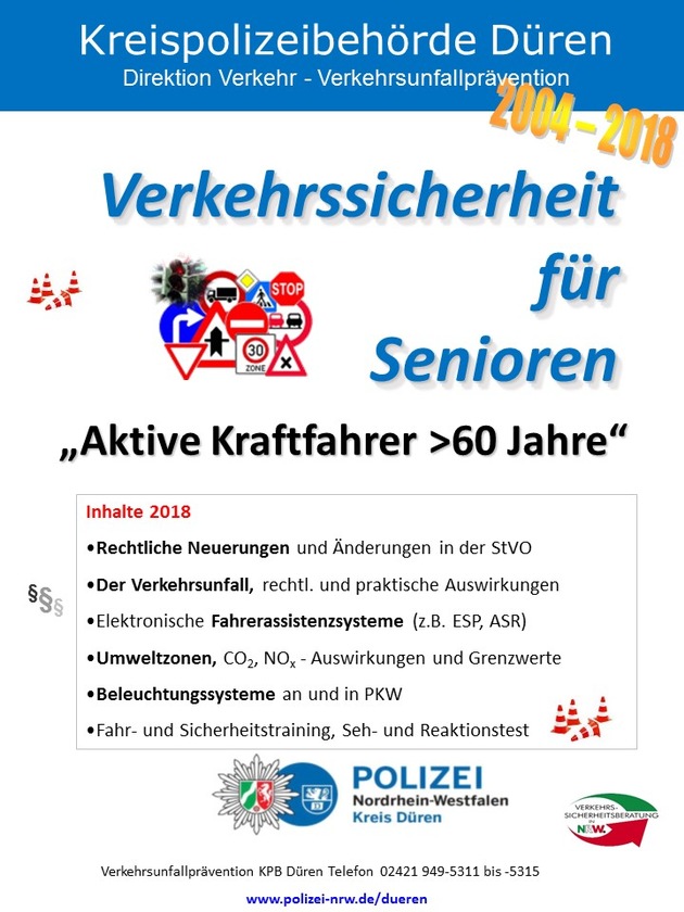 Ab dem 15.02.2018 nehmen die Verkehrssicherheitsberater wieder Anmeldungen für dieses Seminarangebot entgegen. Themenschwerpunkte im Jahr 2018 werden das aktuelle Verkehrsrecht, rechtliche und praktische Auswirkungen eines Verkehrsunfalles, aktuelle Beleuchtungssysteme an und in Pkw sowie Informationen rund um das Thema Umweltzonen sein. Außerdem wird ein Fahr- und Sicherheitstraining als Schnupperkurs sowie mit Unterstützung der Verkehrswacht Jülich ein Seh- und Reaktionstest angeboten. Die Kurse werden sowohl in Jülich als auch in Düren angeboten. Sie beginnen jeweils um 15:00 Uhr und dauern circa 90 Minuten. Die Teilnahme an den Veranstaltungen ist grundsätzlich kostenlos. Lediglich für den praktischen Übungstag werden die dafür entstehenden Kosten anteilig auf die Anzahl der Teilnehmer umgelegt.