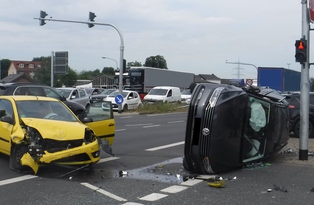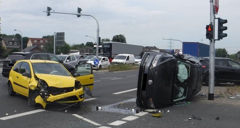 Eine 18-Jährige aus Swisttal befuhr gegen 11: 50 Uhr die B 56 aus Richtung Innenstadt kommend in Fahrtrichtung Autobahn. Zur gleichen Zeit passierte ein 30 Jahre junger Mann aus Düsseldorf die Bundesstraße aus entgegengesetzter Richtung und beabsichtigte links in die Straße "Im Großen Tal" abzubiegen. Bei grünem Pfeil der Lichtzeichenanlage leitete er seinen Linksabbiegevorgang ein und kollidierte mit dem Wagen der 18-Jährigen, die trotz Rotlicht die Kreuzung querte. Durch den Zusammenstoß überschlug sich das Auto des Düsseldorfers und kam im Kreuzungsbereich zum Stillstand.