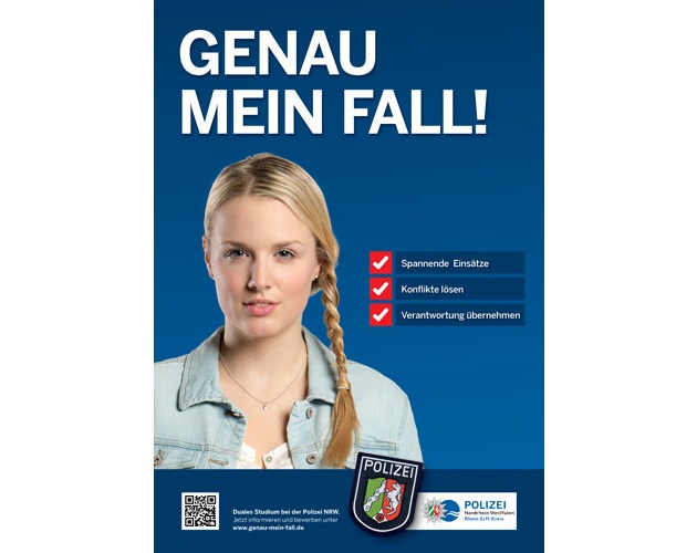 auf der Polizeiwache Kerpen in 50171 Kerpen, Philipp-Schneider-Straße 8-10. Die Teilnehmerplätze sind begrenzt und es wird daher um eine Voranmeldung unter Telefon 02233 52-5252 gebeten. Für junge Frauen und Männer mit Abitur oder Fachabitur, die das 37. Lebensjahr noch nicht vollendet haben, stehen zum 01. September 2017 wieder freie Studienplätze für Kommissarsanwärterinnen und Kommissarsanwärter bei der Polizei NRW zur Verfügung (Fachhochschulstudium, Abschluss: Bachelor). Wenn Sie sich für den Polizeiberuf interessieren und Fragen zu den Einstellungsvoraussetzungen, dem Auswahlverfahren, zum Studium, den beruflichen Perspektiven, dem Verdienst oder sonstigen Aspekten rund um den Polizeiberuf haben, sind Sie herzlich zu der Informationsveranstaltung / Vortrag eingeladen. Nutzen Sie Ihre Chance für einen interessanten, abwechslungsreichen, krisensicheren und auch finanziell attraktiven Beruf. Ein wichtiger Hinweis: Eine (ausschließliche) online-Bewerbung ist nur möglich, wenn man zum Zeitpunkt der Bewerbung das Deutsche Sportabzeichen (mindestens) in Bronze besitzt, welches nicht älter als ein Jahr sein darf. Potenzielle Bewerberinnen und Bewerber sollten das DSA unbedingt frühzeitig ablegen. Ansprechpartner für die Abnahme des DSA kann der Kreissportbund des Rhein Erft Kreises nennen (www.sportangebote-rhein-erft.de) nennen. Das Bewerbungsende für den Einstellungstermin 2017 ist voraussichtlich am 30.September 2016. Weitere Informationen erhalten Sie bei der Einstellungsberatung der Kreispolizeibehörde Rhein Erft Kreis unter der Rufnummer 02233 / 52-5252 sowie per Email über Personalwerbung.rhein-erft-kreis@polizei.nrw.de und unter www.polizei.nrw.de oder www.genau-mein-fall.de. (ab)