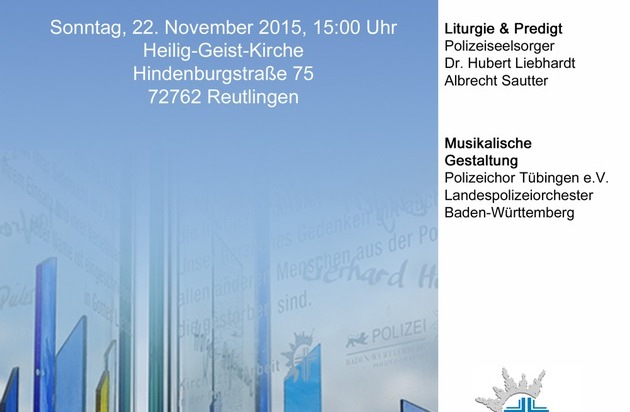Am Sonntag, 22. November 2015, um 15.00 Uhr, findet in der Reutlinger Heilig-Geist-Kirche, die öffentliche Ökumenische Gedenkfeier für die im Dienst getöteten Polizeibeamtinnen und Polizeibeamten des Landes Baden-Württemberg statt. Die Bevölkerung ist dazu herzlich eingeladen.