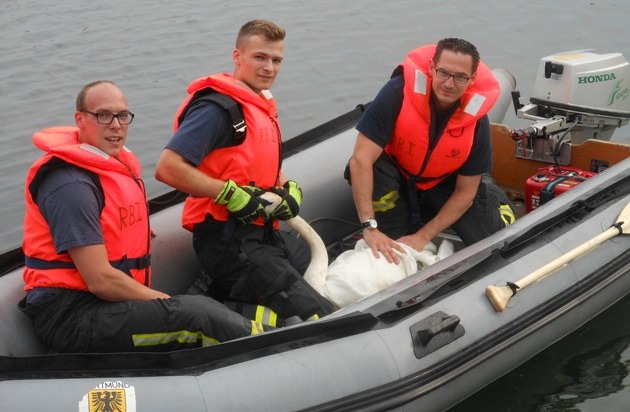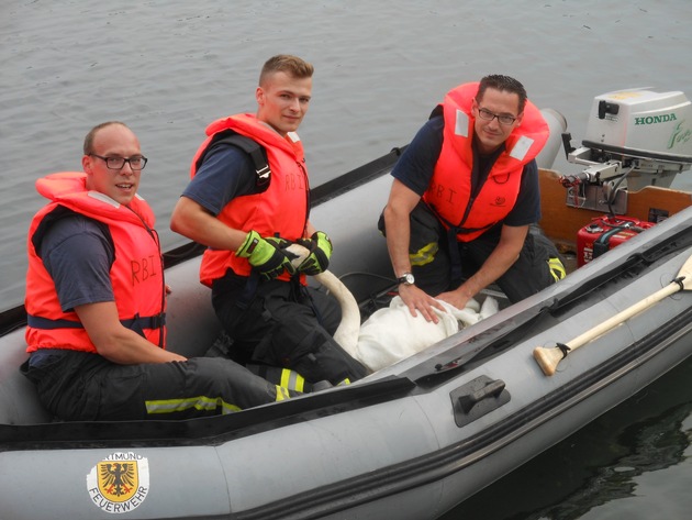 Am frühen Sonntagabend sind Spaziergänger am Dortmund-Ems-Kanal in Do-Groppenbruch auf einen Schwan aufmerksam geworden, der sich mit seinen Beinen in einer Angelschnur verfangen hatte. Zwar konnte der Schwan noch schwimmen, jedoch zog er aber an einer cicra fünf Meter langen Schnur noch einiges an Treibgut aus dem Kanal hinter sich her. Mit einem Rettungsboot konnten die Brandschützer das Tier einfangen und anschließend von seinem unfreiwilligen Anhängsel befreien. Das glücklicheweise unverletzte Tier wurde anschließend direkt wieder in die Freiheit entlassen. Im Einsatz waren Einsatzkräfte von der Feuerwache 9 (Mengede) und der Feuerwache 2 (Eving).