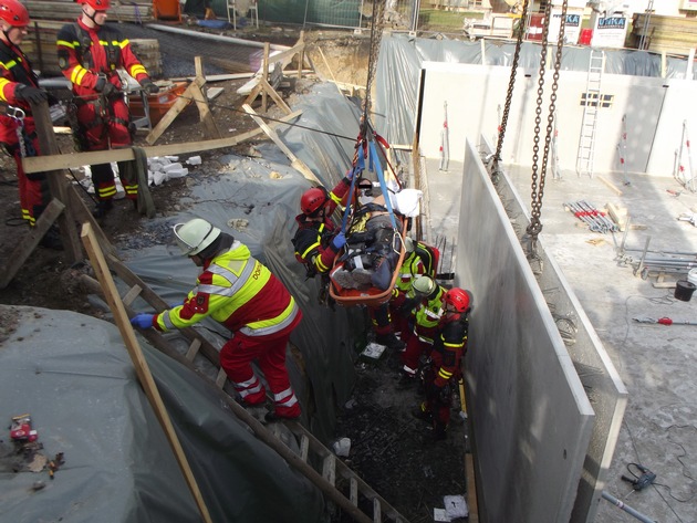 Die Retter bestellten ein Löschfahrzeug und die Höhenrettungsgruppe nach. Bis zum Eintreffen der Feuerwehrleute wurde der Patient durch den Notarzt versorgt und transportfähig gemacht. Mit einer hydraulisch betriebenen Schere wurde die Eisenstange von einem Feuerwehrmann durchtrennt, sodass der Verletzte durch die Einsatzkräfte in einen sogenannten Schleifkorb umgelagert werden konnte. Unter Begleitung eines Höhenretters wurde der Patient mit dem Schleifkorb unter Zuhilfenahme eines Baukranes aus der Grube, direkt zum Rettungswagen befördert. Hier wurde er wieder von den Rettungskräften und dem Notarzt in Empfang genommen und in ein Krankenhaus transportiert.