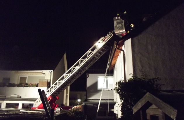 Um kurz nach 19:00 Uhr wurde die Feuerwehr in die Schlangenstrasse alarmiert. Ein lauter Knall schreckte zuvor die Bewohner des zweieinhalbgeschossigen Einfamilienhauses hoch. Bei einem über Dortmund hinwegziehenden Gewitter schlug vermutlich ein Blitz direkt in das Dach des Hauses ein.Beim Eintreffen der ersten Einsatzkräfte war eine Verqualmung des Spitzbodens und des darunterliegenden ausgebauten Dachgeschosses ersichtlich. Mit bis zu drei Trupps gleichzeitig im Innenangriff und einem Außenangriff an der Dachtraufe wurde das Feuer bekämpft. Hierbei unterstützten auch Kräfte des Löschzuges 24 (Asseln) der Freiwilligen Feuerwehr. Schwierig gestaltete sich die Aufnahme der Dachverkleidung von innen, weil die Flammen sich hier in der Zwischdecke ausbreiteten. Durch das weit in den Hinterhof ragende Satteldach und die engen Platzverhältnisse gestaltete sich die Aufnahme von Dachpfannen auch über den Teleskopmast und die Drehleiter sehr schwierig. Aufgrund des absehbar länger andauernden Einsatzes wurde die Spezialeinheit "Versorgung" des Löschzuges 16 (Hombruch) hinzugezogen, um die Einsatzkräfte mit Getränken zu versorgen. Nachdem das Feuer gelöscht war, wurde der betroffene Bereich mit der Wärmebildkamera auf Glutnester kontrolliert. Das Gebäude wurde stromlos geschaltet. Noch in der Nacht wurde durch Einsatzkräfte der Feuerwehr eine sogenannte Revision der Einsatzstelle durchgeführt, um sicher zu stellen, dass auch nichts übersehen wurde. Auch hier wurde die Wärmebildkamera eingesetzt. Menschen kamen glücklicherweise nicht zu schaden. Die Schadenshöhe muss jetzt ermittelt werden. An dem über vier Stunden andauernden Einsatz waren insgesamt 65 Einsatzkräfte der Feuerwachen 3 (Neuasseln), 6 (Scharnhorst), 1 (Mitte), der Löschzüge 16 (Hombruch) und 24 (Asseln) und des Rettungsdienstes beteiligt.