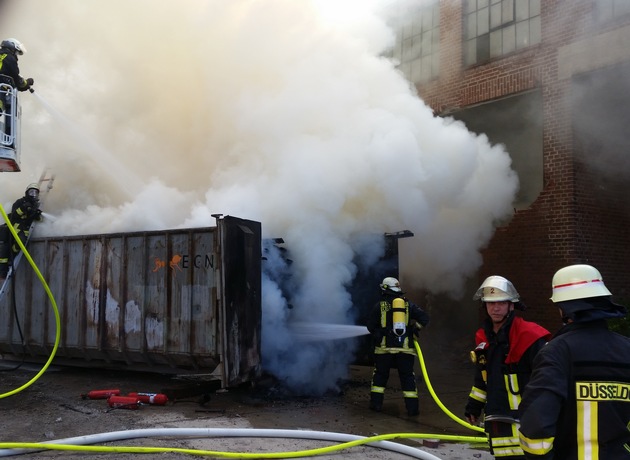 Auf dem Industrieterrain finden zurzeit umfangreiche Abrissarbeiten statt. Dabei sammeln die Bauarbeiter das Altholz in großen 36-Kubikmeter-Containern für eine fachgerechte Entsorgung. Aus ungeklärter Ursache geriet ein Container in Brand. Beim Eintreffen des Löschzuges brannte der Inhalt des Altholzcontainers bereits mit hellen Flammen. "Der Container war mit rund 800 Grad so heiß, dass ein großer Teil des Löschwassers sofort wieder verdampfte. Über 15.000 Liter Löschwasser waren notwendig, um den Flammen Herr zu werden", berichtet Einsatzleiter Oliver Schulz von der Wache in Oberkassel. Die Löscharbeiten unterstütze ein großer Abrissbagger, der das Altholz aus dem Container herausholte. Auf dem Freigelände abgelegt, konnten die Wehrleute mit drei Strahlrohren die Flammen und Glutnester erfolgreich löschen. Nach knapp zwei Stunden rückten die Einsatzfahrzeuge wieder ab.