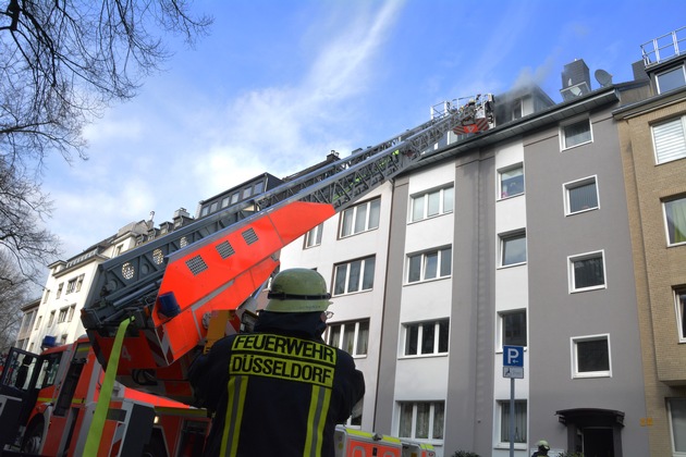 Durch Lärm in ihrer Küche wurde die Eigentümerin der Dachgeschosswohnung in ihrem Arbeitszimmer auf das schon weit fortgeschrittene Feuer an ihrer Küchenzeile aufmerksam. Geistesgegenwärtig alarmierte sie die Feuerwehr und verließ die Wohnung. Dabei schloss sie die Küchentür, welche verhinderte, dass das Feuer und Rauch auf benachbarte Räume übergreifen konnten. Die Wohnungseingangstür ließ sie geöffnet. Die alarmierten Einheiten der Feuerwachen Behrenstraße und Hüttenstraße konnten so schnell in die betroffene Wohnung vorgehen und das Feuer löschen. Währenddessen wurde über die Drehleiter von außen das Fenster geöffnet, um den dichten Brandrauch abziehen zu lassen. Nach weiteren gezielten Belüftungsmaßnahmen, kann die Wohnung durch das Eigentümerehepaar weiter bewohnt werden. Der Einsatz der Feuerwehr Düsseldorf war nach einer guten Stunde beendet. Der Sachschaden wird auf 50.000 Euro geschätzt.