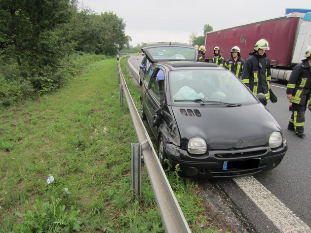 Heute um 09.55 Uhr kam es auf der A40 in Fahrtrichtung Duisburg zwischen Dümpten und Styrum zu einem Verkehrsunfall. Durch die Leitstelle der Berufsfeuerwehr Mülheim an der Ruhr wurden der Hilfeleistungszug der Feuerwache Heißen sowie ein Rettungswagen und ein Notarzteinsatzfahrzeug alarmiert. Aus noch ungeklärter Ursache kam eine Fahrerin mit ihrem Renault Twingo von Fahrbahn ab und prallte gegen die Leitplanke. Durch die Wucht des Aufpralls wurde die Fahrerin leicht verletzt. Nach der Erstversorgung der Fahrerin vor Ort wurde sie anschließend zur weiteren Behandlung ins Elisabeth-Krankenhaus nach Oberhausen gefahren.