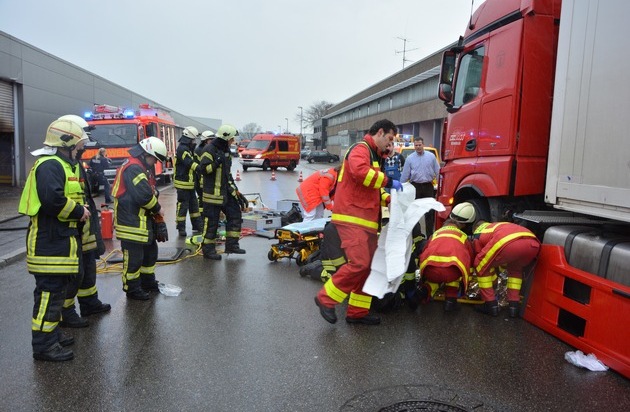 Noch während der Einsatz mit der ausströmenden Gasflasche lief, rückte der Rüstzug der Feuerwehr Mülheim zu einem Verkehrsunfall zur Elbestraße aus. Beim Anfahren hatte der Fahrer eines LKW einen Fußgänger übersehen. Der ältere Herr geriet dabei unter den LKW. Der Fahrer stoppte sofort sein Fahrzeug. Bei Eintreffen war die Person ansprechbar. Nach der Demontage von Teilen der Seitenverkleidung des LKW konnte der Mann mit Hilfe eines Spineboards aus seiner misslichen Lage befreit werden. Während der zirka 20 minütigen Rettungsaktion wurde der Patient kontinuierlich vom Rettungsdienstpersonal und der Notärztin der Feuerwehr versorgt. Zur weiteren Behandlung wurde er in eine Klinik nach Duisburg gebracht. Während des Feuerwehreinsatzes blieb die Elbestraße in beide Fahrtrichtungen gesperrt.(TDr)