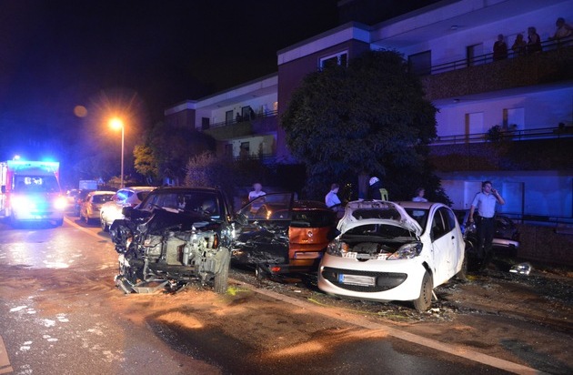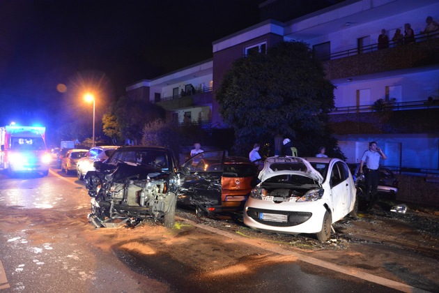 Am späten Freitagabend kam es auf der Kappenstraße zu einem schweren Verkehrsunfall mit drei verletzten Personen. Beim Befahren der oben genannten Straße verlor ein Fahrzeugführer, vermutlich aufgrund eines internistischen Notfalles, die Kontrolle über sein Fahrzeug. Dabei prallte er zunächst auf einen parkenden Kleinwagen den er zirka 20 Meter vor sich herschob. Dabei verkeilte sich der Kleinwagen unter einen Balkon. Bevor das unfallverursachende Fahrzeug zum Stehen kam rammte es noch drei weitere parkende Fahrzeuge und beschädigte diese stark. Alle drei, im Fahrzeug befindliche Personen, trugen zum Teil schwere Verletzungen davon. Nach der Versorgung durch den Rettungsdienst der Feuerwehr sowie der Notärztin wurden die Verletzten in Mülheimer und Essener Krankenhäuser gebracht. Durch die Feuerwehr wurden auslaufende Betriebsstoffe abgestreut, der Brandschutz sichergestellt sowie die Fahrzeugbatterien abgeklemmt. Nach diesen Maßnahmen unterstützte ein Fahrzeug der Feuerwehr die Polizei bei der Unfallaufnahme indem es die Einsatzstelle ausleuchtete. Der Einsatz der Feuerwehr war nach zirka zwei Stunden und 30 Minuten beendet. (TDr)