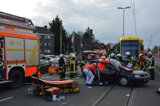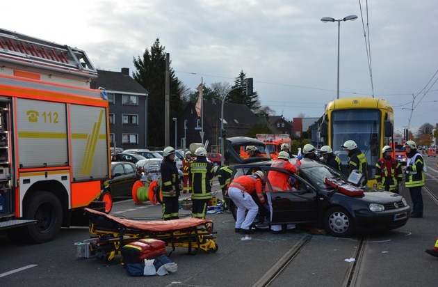 FW-MH: Schwerer Verkehrsunfall zwischen Straßenbahn und PKW - Eine Person eingeklemmt.