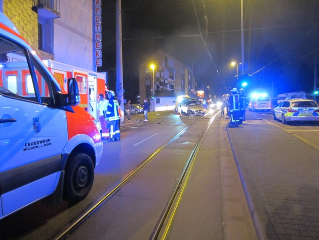 Um circa 20:30 Uhr wurde der Leitstelle der Berufsfeuerwehr Mülheim an der Ruhr ein Verkehrsunfall mit mehreren Betroffenen an der Aktienstraße angemeldet. Bei Eintreffen der Einsatzkräfte stellte sich heraus, dass es sich bei diesem Einsatz um zwei beteiligte Fahrzeuge mit insgesamt sechs Personen handelte. Fünf der betroffenen Personen wurden bei diesem Unfall leicht verletzt. Die Verletzten wurden von der anwesenden Notärztin vor Ort untersucht und anschließend mit den Rettungswagen der Berufsfeuerwehr in umliegende Krankenhäuser transportiert. Die Feuerwehr leuchtete, zur Unterstützung für die Unfallaufnahme der Polizei, die Einsatzstelle aus. Für die gesamte Einsatzdauer von ungefähr 45 Minuten wurde der Kreuzungsbereich Aktienstraße Ecke Kreuzfeldstraße in Fahrtrichtung Stadtmitte gesperrt. Der Straßenbahnverkehr in Richtung Stadtmitte musste für die gesamte Einsatzdauer ebenfalls eingestellt werden. (KHü)