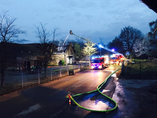 Unter dem Stichwort Gebäudebrand wurde die Feuerwehr um 5.44 Uhr zum Eschenbruch in Mülheim Saarn alarmiert. Schon auf der Anfahrt war ein Feuerstein und starke Rauchentwicklung zu erkennen. Aufgrund der ersten Erkenntnisse wurden weitere Fahrzeuge zur Einsatzstelle nachalarmiert. Für die Freiwillige Feuerwehr wurde Vollalarm ausgelöst. Der Dachstuhl sowie große Gebäudeteile eines zirka 30 mal 40 Meter großen Verwaltungs- und Lagergebäudes standen in Vollbrand. Personen waren nicht im Gebäude. Das Feuer wurde über zwei Drehleitern und drei weiteren Rohren bekämpft. Mehrere Gasflaschen wurden aus dem Gebäude geborgen. Die Wasserversorgung wurde über eine Strecke von zirka einem Kilometer von der Kölner Straße sichergestellt. Das Feuer war nach zirka einer Stunde und zwanzig Minuten unter Kontrolle. Die Nachlöscharbeiten werden noch mehrere Stunden in Anspruch nehmen. Die Kölner Straße ist zur Zeit (07.50 Uhr) im Bereich Eschenbruch gesperrt. Der Eschenbruch ist seit 6.00 Uhr voll gesperrt. (TDr)