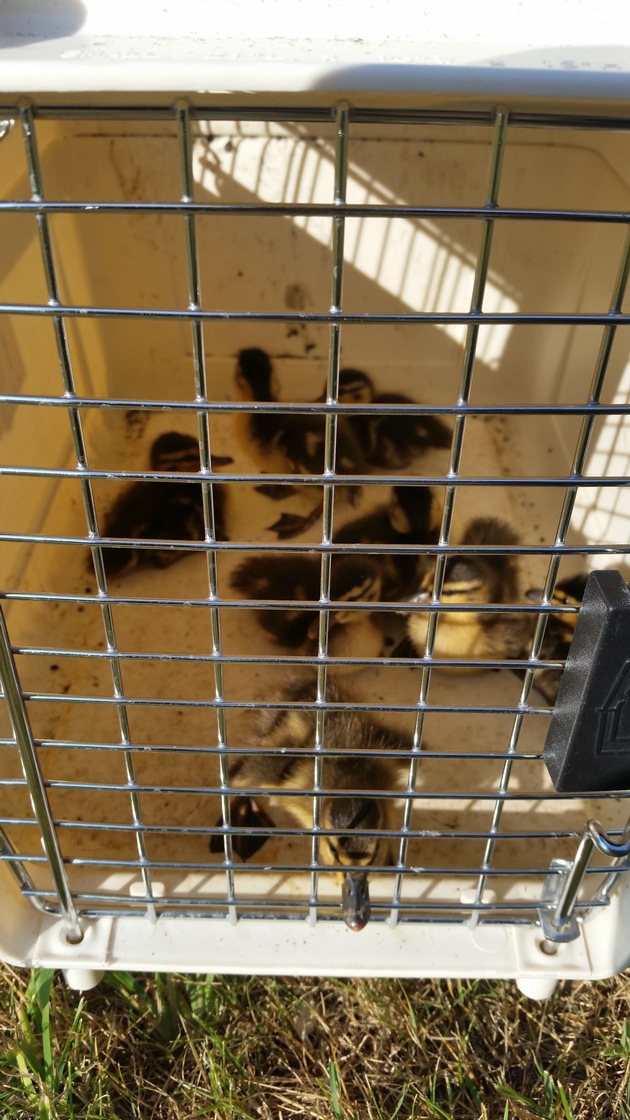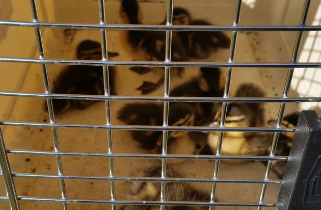 Am heutigen Vormittag wurden die Kollegen des "Kleineinsatzfahrzeug Tiere" zu einer Entenfamilie gerufen, die sich an der Steinkampstraße verirrt hatte. Ein aufmerksamer Bürger hatte die acht Entenküken samt Entenmutter bereits aus dem Gefahrenbereich der stark befahrenen Straße geführt. Die Entenmutter verließ die Einsatzstelle nach kurzer Zeit und wurde nicht mehr gesichtet. Da die Küken ohne Mutter den Gefahren der Ruhr schutzlos ausgeliefert wären, entschieden die Kollegen, die Küken in das Mülheimer Tierheim zu transportieren, wo sie versorgt werden. Der Einsatz war nach ca. einer Stunde beendet. (VHa)