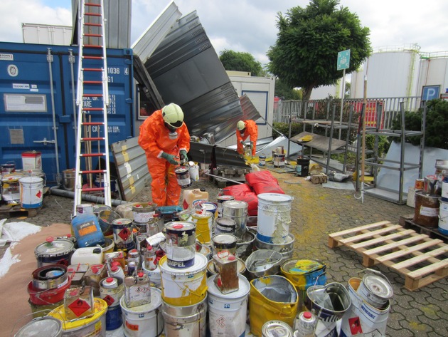 Am Montag gegen 12:30 Uhr ging bei der Leitstelle der Feuerwehr Mülheim eine Information über auslaufende Gefahrstoffe auf einem Betriebsgelände im Hafengebiet ein. Unverzüglich wurde ein Führungsdienst und der Gefahrgutzug zur Einsatzstelle entsandt. Auf einem Betriebsgelände im Hafengebiet war bei Umladearbeiten mit einem Kran ein gefüllter Lagercontainer für Lösungsmittel und Lacke umgekippt. Durch den Aufprall wurde der Container zerstört und die darin befindlichen Kleingebinde verteilten sich auf dem Betriebsgelände. Dabei wurde ein Großteil der Behältnisse für Lacke, Lösemittel und Öle beschädigt.Durch die Feuerwehr wurden die leck geschlagenen Behältnisse unter Schutzanzügen und mit Atemschutz in fünf große Sicherheitsheitscontainer verpackt und sichergestellt. Ein weiteres Ausbreiten von umweltgefährlichen Stoffen konnte somit verhindert werden. Das Umweltamt und die Polizei haben weitere Ermittlungen aufgenommen. Bei dem Zwischenfall auf dem Betriebsgelände wurden keine Personen verletzt. Der Einsatz war für die Feuerwehr nach zirka zweieinhalb Stunden beendet. (HJF)