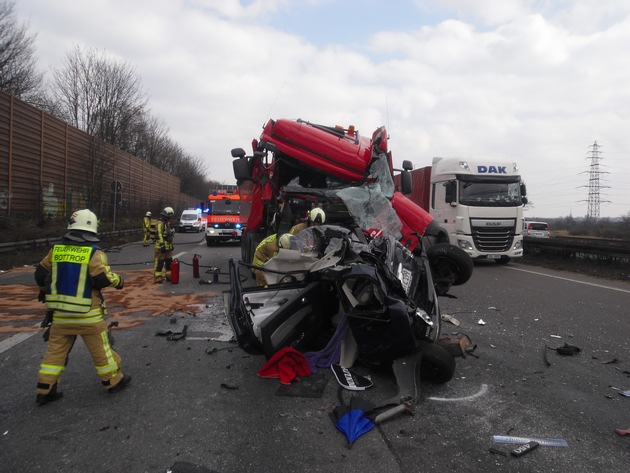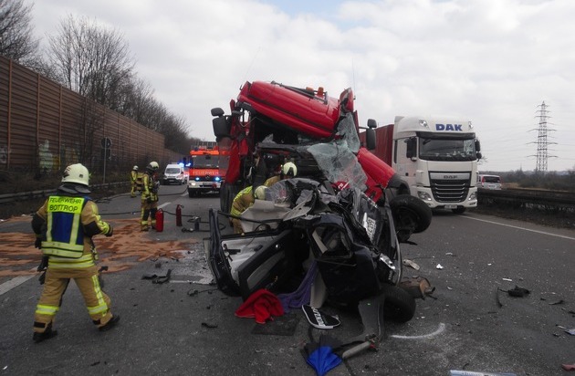 Bottrop, A42; Am heutigen Mittwoch den 16.03.2016 kam es um ca. 12.35 Uhr zu einem schweren Verkehrsunfall auf der A42 in Fahrtrichtung Duisburg. Aus noch ungeklärter Ursache ist es im stockenden Verkehr kurz vor der Abfahrt Oberhausen-Neue Mitte zu einem folgenschweren Unfall zwischen zwei LKW, einem Kleintransporter sowie einem PKW gekommen. Bei dem Unfall wurde die Fahrerin des Kleinwagens schwer verletzt. Ersthelfer befreiten die Frau aus dem Unfallwrack. Nach Eintreffen der Rettungskräfte wurde sie durch den Notarzt versorgt und in eine Spezialklinik eingeliefert. Erste Meldungen, dass eine Person eingeklemmt wäre, haben sich glücklicherweise nicht bestätigt. Weiter wurde ein LKW- Fahrer sowie der Fahrer des Kleintransporters bei dem Unfall verletzt. Beide Personen wurden durch den Rettungsdienst versorgt und in Krankenhäuser transportiert. Während der Rettungsarbeiten wurde im schwer beschädigten LKW ein kleiner Hund entdeckt und aus dem Wrack geholt. Der Hund überstand den Unfall verängstigt aber augenscheinlich unverletzt. Die Feuerwehr nahm den Hund mit zur Feuerwache wo er im Laufe des Nachmittages durch eine Angehörige des LKW-Fahrers abgeholt wurde. Bei dem Unfall sind große Mengen Kraftstoff ausgelaufen, welche durch die Feuerwehr abgestreut wurden. Die Feuerwehr war mit ca. 25 Einsatzkräften bis ca. 14:00 vor Ort. Die Unfallursache wird durch die Polizei ermittelt.