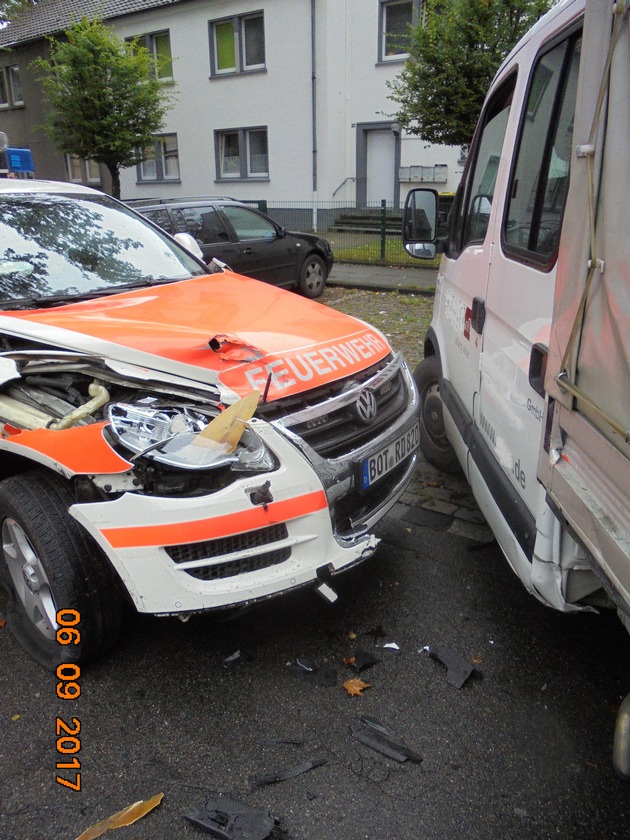 Ein Notarzteinsatzfahrzeug der Feuerwehr Bottrop ist heute morgen gegen 10.35 Uhr in einen Unfall verwickelt worden. Das Fahrzeug befand sich mit eingeschaltetem Blaulicht und Sondersignal auf dem Weg zu einem medizinischen Notfall in Bottrop-Stadtmitte. Während eines Überholvorganges auf der Eichenstraße kam es zu einer Kollision mit einem abbiegenden Kleintransporter. Dabei wurde das Notarzteinsatzfahrzeug erheblich beschädigt. Ein abgestelltes Fahrzeug wurde ebenfalls in Mitleidenschaft gezogen. Verletzt wurde bei dem Unfall niemand. Den ursprünglichen Einsatz übernahm ein anderes Notarzteinsatzfahrzeug der Feuerwehr Bottrop. Das Unfallfahrzeug war nach der Kollision nicht mehr fahrbereit und musste abgeschleppt werden. Die Polizei hat die Ermittlungen zum Unfallhergang aufgenommen.