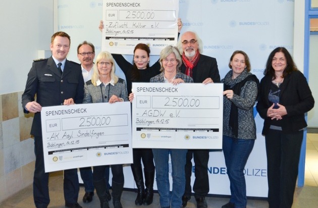 "Alle Menschen werden Brüder" - unter diesem Motto veranstaltete die Bundespolizeiinspektion Stuttgart in Zusammenarbeit mit dem Rotary-Club Sindelfingen am 14.November 2015 um 19:30 Uhr ein Benefizkonzert zu Gunsten von Flüchtlingen. Rund 400 Zuschauer verfolgten die Veranstaltung im großen Konzertsaal der Staatlichen Hochschule für Musik und Darstellende Kunst (Musikhochschule) in Stuttgart. Gestern Abend (14.12.2015) wurde nun im feierlichen Rahmen der Erlös von insgesamt 7.500,-EUR zu je einem Drittel an die gemeinnützigen Vereine AGDW, Zuflucht Kultur und AK Asyl Sindelfingen übergeben. Mit dem Geld können durch die Organisationen verschiedene Projekte initiiert bzw. unterstützt werden. So erweitert beispielweise die AGDW ihr Angebot zur Betreuung traumatisierter jugendlicher Flüchtlinge, AK Asyl Sindelfingen baut sein Angebot für Sportkurse in verschiedenen Gemeinschaftsunterkünften aus und Zuflucht Kultur finanziert einen Großteil des Bühnenbildes einer neuen Oper, die gerade einstudiert wird.