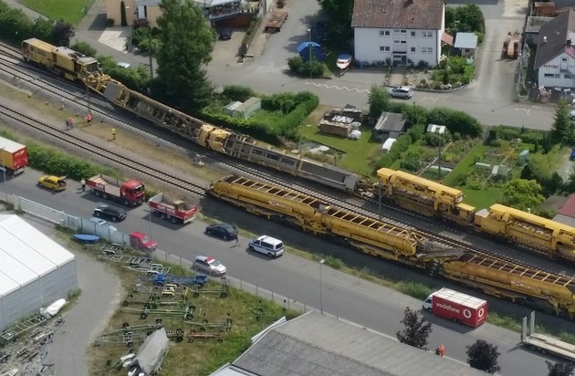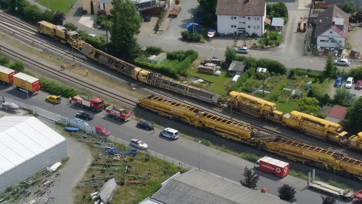 Bei Gleisbauarbeiten in der Nähe des Bahnhofs Radolfzell ist heute Mittag ein Bauzug teilweise umgekippt. Die umgekippten Teile ragen seither auf einer Länge von 60 Metern in das Nachbargleis. Der Zugverkehr musste eingestellt werden.
