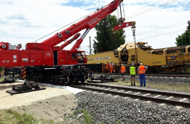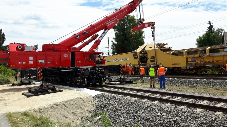 Nach dem Bahnbetriebsunfall in der Nähe des Bahnhofs Radolfzell haben heute Morgen gegen 09:00 Uhr vier Spezialkräne am Ereignisort damit begonnen, die umgekippten Teile des Bauzuges wieder aufzurichten. Dieser Bergungsschritt ist mittlerweile abgeschlossen (siehe Bildmaterial). Der verunfallte Bauzug wird voraussichtlich gegen 18:00 Uhr wieder eingegleist sein.