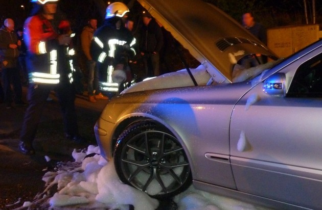 Noch während des Übungsdienstes der Freiwilligen Feuerwehr alarmierte die Leitstelle um 20:51 Uhr eine Löschgruppe an die Höseler Straße. Vor dem Kreisverkehr in der Oberilp stand in Fahrtrichtung Heiligenhaus der Motorraum einer Mercedes E-Klasse in Flammen. Als die Einsatzkräfte kurze Zeit später eintrafen, hatte sich das Feuer bereits in den Kabelschacht der Mittelkonsole ausgebreitet. Der Motorraum wurde mit Löschschaum eingedeckt, der die Flammen erstickte.