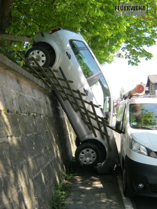 An der Wulfeistraße in Lasbeck machte sich gestern Mittag ein PKW selbstständig. Das Fahrzeug rollte einen Hang hinab, durchbrach einen Jägerzaun und stürzte eine Mauer hinunter. Der PKW blieb senkrecht zwischen der Mauer und einem geparkten Lieferwagen stecken. Verletzt wurde hierbei glücklicherweise niemand. Die alarmierte Feuerwehr sicherte den Unfallwagen mit einem Kettenzug. Die anschließende Bergung des Kleinwagens übernahm ein örtliches Abschleppunternehmen mit einem Kran.