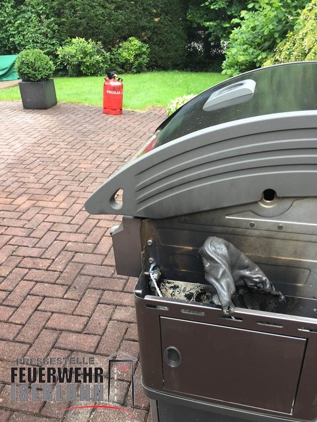 Zu einem brennenden Gasgrill in unmittelbarer Nähe zu einem Gebäude wurden die Einsatzkräfte der Feuerwehr Iserlohn heute um 15:15 Uhr alarmiert. Im Ortsteil Dröschede hatte abströmendes Gas in einem Gasgrill Feuer gefangen. Unter hohem Druck brannte eine waagerechte Flamme in Richtung Hauswand. Mit einem C- Rohr konnte die Flamme eingefangen und die Gasflasche abgedreht werden. Bereits brennende Kunststoffteile des Grills konnten schnell gelöscht werden. Die Gasflasche sowie die Hausfassade wurden abschließend mittels einer Wärmebildkamera auf Erwärmung kontrolliert. Der Einsatz war bereits nach wenigen Minuten beendet, da glücklicherweise kein größerer Schaden entstanden war und auch niemand verletzt wurde.