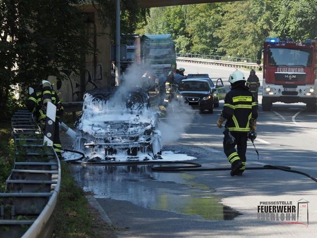 Zu einem Fahrzeugbrand am Zubringer (B236) zur BAB 46 bei Iserlohn-Oestrich rückte die Berufsfeuerwehr Iserlohn heute Nachmittag um 14:28 Uhr aus. In Höhe des Stenglingser Wegs stand bei Eintreffen der Einsatzkräfte ein Renault Megane in Fahrtrichtung Untergrüne und brannte in voller Ausdehnung. Mit einem C-Rohr, und im weiteren Verlauf mit einer Schaumpistole, wurde der Brand unter Atemschutz durch die Beamten gelöscht. Personen kamen nicht zu Schaden.
