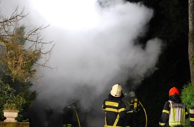 Um 19:55 Uhr wurde der Einsatzzentrale ein Garagenbrand an der Straße "Rheiner Mark" in Iserlohn - Hennen gemeldet. Beim Eintreffen der Berufsfeuerwehr brannte die Garage am Einfamilienhaus in voller Ausdehnung. Der Bewohner hatte das Gebäude bereits verlassen. Sofort wurden drei C-Rohre unter Atemschutz zur Brandbekämpfung und zum Schutz des Wohnhauses durch die Trupps von Berufs- und Freiwilliger Feuerwehr vorgenommen. Ein Übergreifen auf das Wohnhaus konnte so verhindert werden. Für das in der Garage befindliche Fahrzeug und weiteres Mobiliar gab es keine Rettung. Personen kamen nicht zu Schaden. Um weitere Nachlöscharbeiten mit dem Schaumrohr in der Garage durchzuführen, musste das Garagentor mit hydraulischem Rettungsgerät aus der Verankerung geschnitten werden. Um 22:30 Uhr war der Einsatz beendet. Brandursache und Schadenshöhe werden durch die Polizei ermittelt. Vor Ort im Einsatz waren der Löschzug der Berufsfeuerwehr, der Rettungsdienst und die Löschgruppe Hennen der Freiwilligen Feuerwehr. Die Feuerwache wurde derweil von den Löschgruppen Iserlohner Heide, Bremke, der Drehleiter der Löschgruppe Letmathe und der Funkgruppe besetzt.