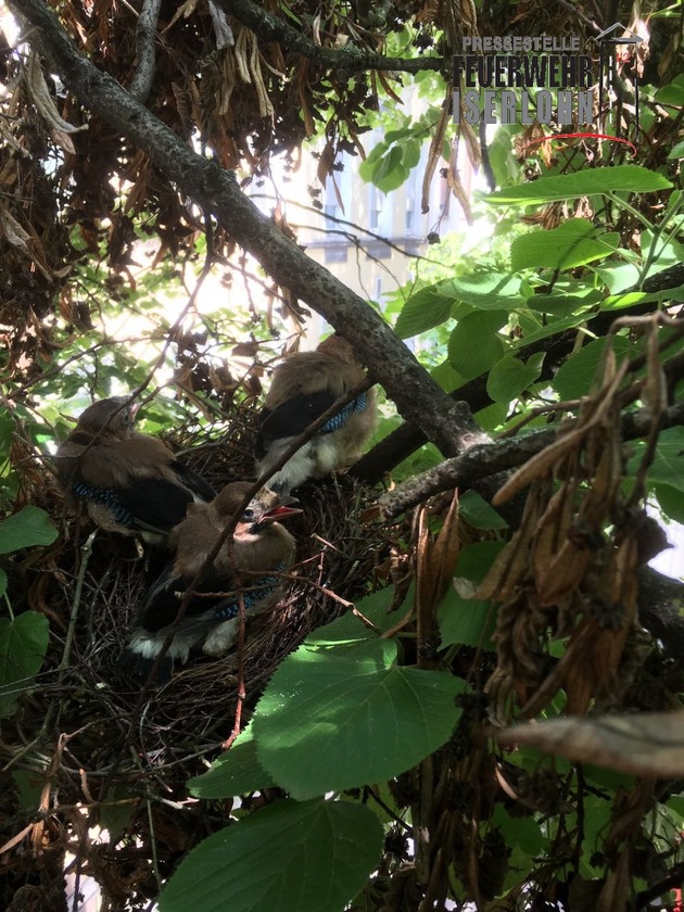 Um 12:15 Uhr wurde die Drehleiter der Berufsfeuerwehr zu einer Tierrettung an der Mendener Straße alarmiert. Eine Passantin hatte in einem Karton vier Eichelhäher-Jungen. Sie gab an, dass sie aus einem Nest aus einer Krone eines Baums an der vielbefahrenen Mendener Straße gefallen sind. Die jungen Vögel waren von der Frau bestens mit Wasser versorgt worden. Die Eltern der Jungtiere warteten aufgeregt in der Baumkrone. Die Beamten brachten die Drehleiter in Stellung, fuhren in die Krone der Linde und setzten die Jungtiere in das Nest. Kaum war die Drehleiter eingefahren, begrüßten die Eltern ihre Jungen. Hoffentlich gab es keinen Ärger!