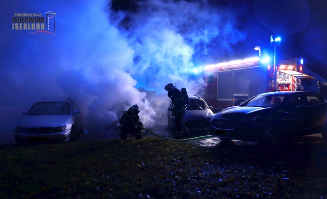 Am frühen Samstagmorgen um 05:42 Uhr wurde die Feuerwehr Iserlohn zu einem Fahrzeugbrand am Föhrenweg im Ortsteil Nußberg gerufen. Bei Eintreffen der Berufsfeuerwehr brannte ein geparkter Seat im Motorraum in voller Ausdehnung. Mit einem C-Rohr unter Atemschutz konnten die Einsatzkräfte ein Übergreifen auf daneben geparkte Fahrzeuge verhindern und das Feuer löschen. Mindestens ein geparktes Fahrzeug wurde durch die Wärmestrahlung aber trotzdem nicht unerheblich beschädigt. Die Schadenshöhe und die Brandursache werden durch die Polizei ermittelt. Personen kamen nicht zu Schaden.
