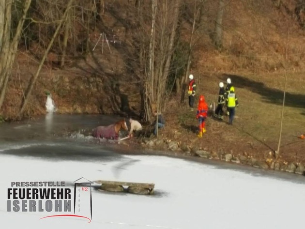 Am 02.03.2018 um 13:43Uhr wurden die Einsatzkräfte der Berufsfeuerwehr Iserlohn zu einer Tierrettung zum Gut Magney im Ortsteil Griesenbrauck gerufen. Ein Pferd war auf das Eis eines zugefrorenen Teiches gelaufen und nach ca. 2m eingebrochen. Der Eigentümer hatte das Pferd bereits mit Zaumzeug und einem Zügel gesichert. Unter Vornahme eines Vorschlaghammers konnte die Eisdecke um das Pferd herum vorsichtig zerkleinert werden. Nach der Befreiung wurde das Pferd in den Stall geführt und erst einmal richtig trocken gerubbelt.