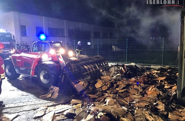 Berufsfeuerwehr und Löschgruppe Stadtmitte mussten in der Nacht einen arbeitsintensiven Containerbrand bekämpfen. Gegen 23:00 Uhr erfolgte der Alarm zu einem Einsatz, der sich über gut vier Stunden hinziehen sollte. Der Inhalt einer Kartonagenpresse war auf einem Hinterhof in der Arnsberger Straße in Brand geraten. Da der Container nahe an einem Wohn- und Geschäftshaus stand, wurde dieser zunächst mit einem Wechelladerfahrzeug umgesetzt. Nach dem der Container geöffnet wurde, musste der Inhalt vollständig ausgeräumt und abgelöscht werden. Mit zwei C- Rohren und unter Atemschutz war dies eine kräftezehrende Aufgabe, die im weiteren Verlauf durch den Einsatz des Multifunktionsgerätes "Manitou" unterstützt wurde. Während des Einsatzes wurde die Feuerwache durch die Löschgruppen Iserlohner Heide und Bremke besetzt. Diese Einheiten rückten zu einem weiteren Kleinbrand nach Letmathe aus. Am Rande des Stübbeker Sommerfestes geriet parallel ein Papiercontainer in Brand. Zu diesem Einsatz wurden die Löschgruppen Stübbeken und Letmathe alarmiert. Größerer Schaden konnte verhindert werden.