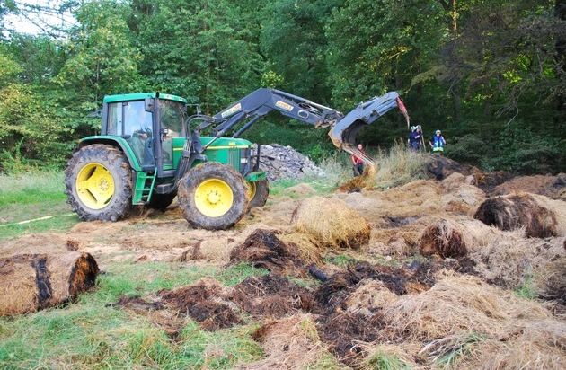 Am heutigen Samstagabend musste die Feuerwehr Iserlohn zu einem Bauernhof an der Rheinener Straße ausrücken. Gegen 19 Uhr waren dort Strohballen und Wiesenfläche an einem Waldrand in Brand geraten. Zur Brandbekämpfung wurden zwei C-Rohre unter Atemschutz eingesetzt, die Löschwasserversorgung konnte aus einem Unterflurhydranten auf dem Hof sichergestellt werden. Zum Einsatz kam außerdem der Traktor eines Landwirtes, mit dem das Brandgut auseinandergezogen wurde. Hierdurch konnte das Feuer schnell unter Kontrolle gebracht und ein Übergreifen der Flammen auf den angrenzenden Wald verhindert werden. An dem über zweistündigen Einsatz waren rund 60 Einsatzkräfte von Berufs- und Freiwilliger Feuerwehr beteiligt. Zur Brandursachen hat die Polizei die Ermittlungen aufgenommen.