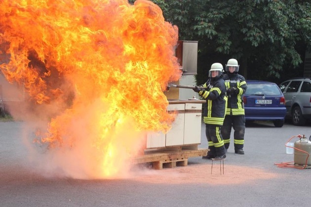 Sicherlich sehr eindrucksvoll für die Besucher dürfte die Vorführung einer Fettexplosion sein. Dabei wird die Feuerwehr an einer aufgebauten Küche zeigen, was passiert, wenn brennendes Fett mit dem falschen Löschmittel Wasser gelöscht wird.