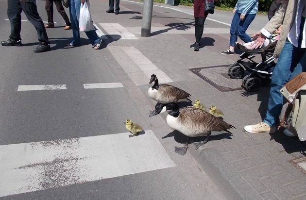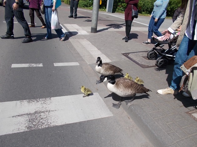 Mama, Papa und fünf junge Gänslein watschelten gemütlich durch die Fußgängerzone in Richtung Peter-Bürling-Platz wo sie schließlich von der bereits verständigten Polizei angehalten wurden. Ausweisen konnte Papa Gans sich und seine Familie nicht, es lag jedoch nahe, dass die Familie am Kahnweiher gemeldet sein muss. Die ebenfalls verständigte Feuerwehr geleitete schließlich die junge Familie, unterstützt von zahlreichen Passanten, zurück über die Dolmanstraße zum nahegelegenen Weiher.