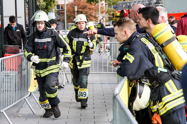 FW-KLE: Bedburg-Hauer Feuerwehrmann Lukas Schiemann beim 9. Skyrun der Feuerwehr Düsseldorf