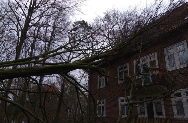 FW-KLE: Sturmtief "Friederike": Erste Bilanz der Freiwilligen Feuerwehr Bedburg-Hau - Bahnstrecke Krefeld - Kleve gesperrt - Baum auf Mehrfamilienhaus