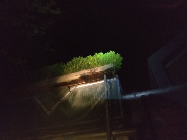 Da der Bewohner der Dachgeschosswohnung nicht anwesend war, mussten die Feuerwehrmänner über eine zweiteilige Steckleiter auf den Balkon klettern. Abstellen konnten sie das Wasser nicht, da die Konstruktion durch die Hauswand in die verschlossene Wohnung führte. Kurzer Hand, bauten sie die Anlage um, so dass das Wasser in die Regenrinne ablaufen konnte.