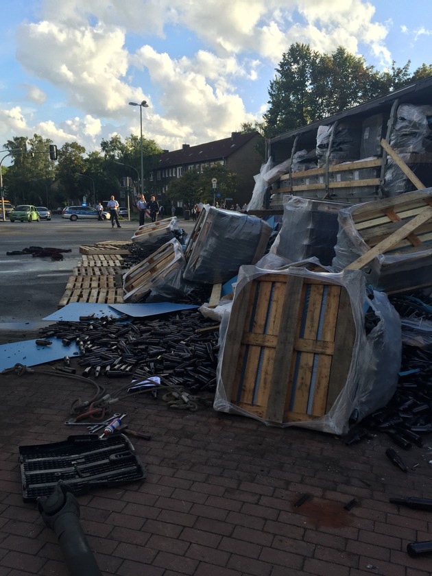 Am Montag, 14. September 2015 um 15:10 Uhr, verunfallte in Gelsenkirchen Heßler ein LKW mit seinem Sattel Auflieger beim Abbiegen von der Grothusstraße auf die Uferstraße.