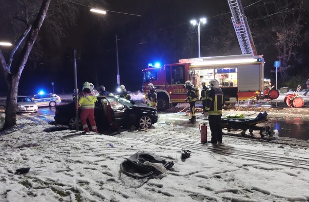 Der Fahrer eines BMW befuhr gegen 21:00 Uhr die Feldmarkstraße und schleuderte aus bisher ungeklärter Ursache gegen einen Baum am Fahrbahnrand. Aufgrund der starken Deformation im Bereich der A-Säule war der Fahrer mit den Füßen eingeklemmt. Er konnte sich nicht selbstständig befreien. Die Einsatzkräfte der Feuerwehr setzten zu Rettung des verunfallten Fahrers schweres Rettungsgerät ein, um das Fahrzeug im Bereich der Pedale aufzutrennen und eine größere Öffnung zu schaffen. Da der Patient während der Rettungsmaßnahmen bei Bewusstsein war wurde in Absprache mit dem Notarzt eine patientenschonende Rettung über die Rücksitze durchgeführt. Hierbei lieferte die sogenannte Rettungskarte des Autoherstellers wichtige technische Informationen an die Einsatzkräfte vor Ort. Der Rettungswagen transportierte den Patient abschließend in den Schockraum einer Gelsenkirchener Klinik. Während des Einsatzes musste die Feldmarkstraße komplett gesperrt werden, da die Einsatzstelle mit Hilfe der Drehleiter umfangreich ausgeleuchtet wurde. Auch der Straßenbahnverkehr kam zum Erliegen.