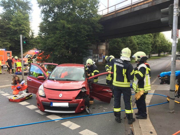Am heutigen Samstag gegen 18.24 Uhr wurde die Feuerwehr Gelsenkirchen zu einem schweren Verkehrsunfall in die Kreuzung der Straßen "An der Rennbahn/Kranefeldstraße" gerufen. Dort waren zwei PKW mit insgesamt 6 Insassen, darunter zwei Kinder ( 6 und 8 Jahre alt), kollidiert. Alle Fahrzeuginsassen wurden verletzt und in Krankenhäuser transportiert. Ein 60 jährige Frau wurde in ihrem Renault Clio eingeklemmt und musste mit hydraulischen Rettungsgerät befreit werden. Zwei Löschzüge der Berufsfeuerwehr, 6 Rettungswagen und zwei Notärzte (insgesamt ca. 50 Einsatzkräfte ) kümmerten sich um die Versorgung der Verletzten. Der Sachschaden wird auf ca. 50.000 Euro geschätzt. Die genaue Unfallursache muss von der Polizei ermittelt werden.