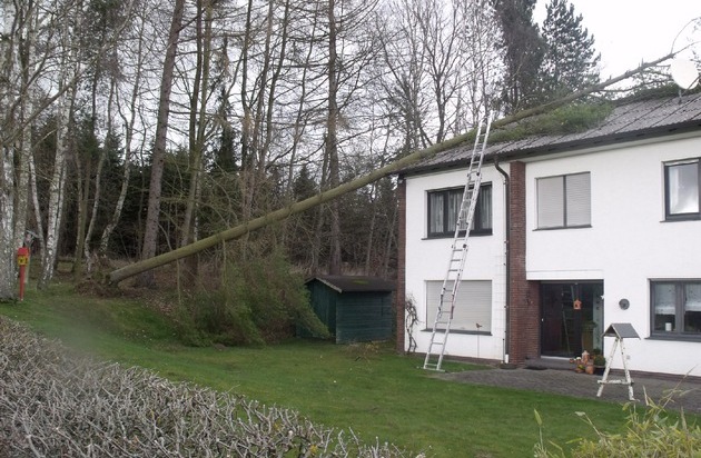 Im Herdringer Stockhausenweg, in der Kardinal-Jäger-Straße auf Bergheim und in Niedereimer in der Straße Zum Eichhahn beschädigten umgestürzte Bäume Hausdächer. Die Wehrleute befreiten die Gebäude von dieser ungewollten Last. Zudem beschädigte der starke Wind weitere Hausdächer in Arnsberg in der Straße Unterm Römberge und in der Herdringer Dungestraße. Außerdem löste der Sturm das Dach eines Carports am Neheimer Besenberg. Auch hier war der Einsatz der Feuerwehr erforderlich, um weitere Beschädigungen an den Gebäuden und in der Umgebung durch umherfliegende Dachteile zu verhindern.