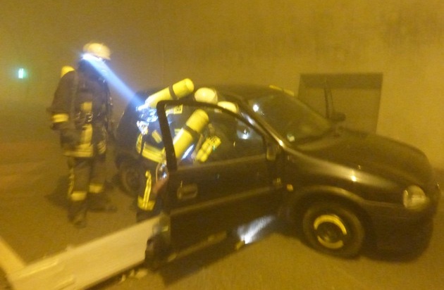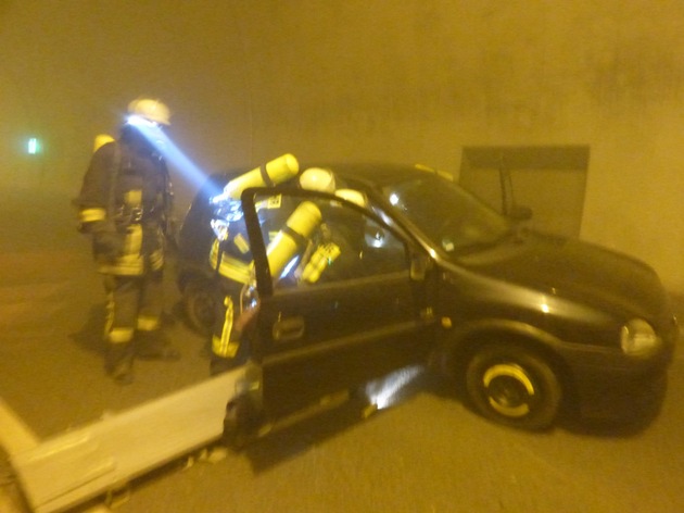 Nach dem Eintreffen leiteten die Feuerwehr-Einheiten ihre Rettungsmaßnahmen von beiden Tunneleingängen aus gleichzeitig ein. Jeweils ein Einsatz-Trupp ging mit schwerem Atemschutz zur Erkundung und zur Menschenrettung sowohl von der westlichen als auch von der östlichen Seite in den Mit Übungsnebel vollständig verrauchten Tunnel vor. Schnell gaben die Trupps die Rückmeldung, dass die beiden verletzten Personen nicht in ihren Fahrzeugen eingeklemmt waren und somit sofort gerettet werden konnten. Parallel zu den Rettungsarbeiten wurde von den übrigen Einsatzkräften eine Löschwasserversorgung aufgebaut, so dass schnellst möglich die Brandbekämpfung eingeleitet und der angenommene Fahrzeug-Brand gelöscht werden konnte.