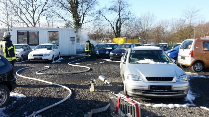 Schließlich wurde der Kreisleitstelle gegen 15:00 Uhr gemeldet, dass auf dem Ausstellungsplatz eines KFZ-Händlers an der Neheimer Stembergstraße ein direkt neben einem Bürocontainer abgestelltes Fahrzeug brenne. Umgehend wurden der Löschzug Neheim sowie erneut die beiden Hauptwachen Neheim und Arnsberg alarmiert. Bereits auf der Anfahrt zum Einsatzort rüstete sich ein Einsatztrupp mit Atemschutzgeräten aus, um vor Ort ohne Verzögerung mit der Brandbekämpfung begonnen zu können. Mit einer sogenannten Schaumpistole wurde der Fahrzeugbrand bekämpft. Der Vorteil der Schaumpistole besteht in ihrer schnellen Einsetzbarkeit und dem geringen Einsatz von Schaummittel, um eine gute Löschwirkung zu erzielen. So konnte das brennende Fahrzeug schnell gelöscht werden, und nach einer gründlichen Kontrolle auf verbliebene Glutnester konnte schließlich auch dieser letzte Einsatz beendet werden.
