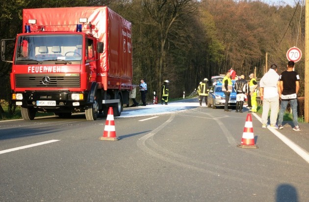 Voßwinkel. Am Sonntag, den 10. April wurde die Löschgruppe Voßwinkel der Arnsberger Feuerwehr gegen 18:00 Uhr zu einem Verkehrsunfall an der Bundesstraße 7 in Höhe des Stakelbergs in Voßwinkel alarmiert. Da die hauptamtlichen Einsatzkräfte der beiden Hauptwachen Neheim und Arnsberg zur Alarmzeit in einem Parallel-Einsatz in Arnsberg-Bruchhausen gebunden waren, wo ein Rauchmelder in einer Grundschule einen Fehlalarm ausgelöst hatte, wurden die Voßwinkeler Blauröcke zu dem zeitgleichen Verkehrsunfall entsandt.