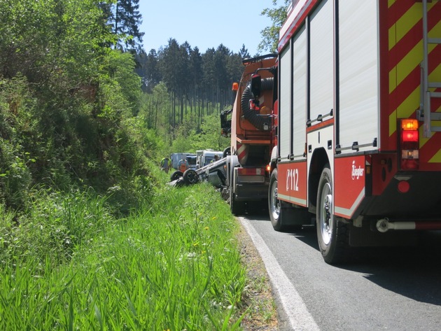 Arnsberg. Am 12. Mai ereignete sich gegen 12:20 Uhr ein Verkehrsunfall auf der Sunderner Straße zwischen Arnsberg und Sundern, dem sogenannten "Ochsenkopf". Aus bisher ungeklärter Ursache überschlug sich dort ein PKW und kam auf dem Dach zur Hälfte im Straßengraben zum Liegen. Über den Notruf war der Feuerwehrleitstelle in Meschede eine eingeklemmte Person gemeldet worden, doch glücklicherweise konnten die Insassen trotz ihrer Verletzungen noch vor dem Eintreffen der Feuerwehr das Fahrzeug aus eigener Kraft verlassen.