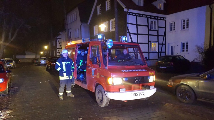 Arnsberg-Neheim. Am Montagabend (23. Januar) wurde die Feuerwehr Arnsberg um kurz vor 20 Uhr zu einem Einsatz auf der Burgstraße in Neheim gerufen. An einem alten Fachwerkhaus war ein Feuer im Fachwerk der Hauswand (Außenfassade) bemerkt worden. Kräfte der Hauptwache Neheim sowie vom Löschzug Neheim waren im Einsatz.